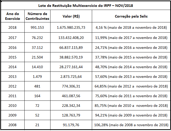 do IRPF 2018. O lote de restituição do Imposto sobre a