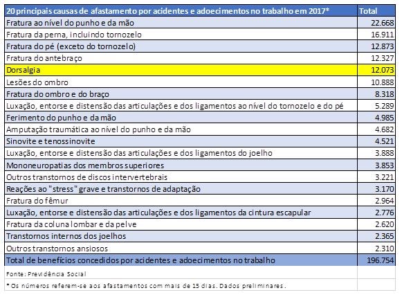 2017, os casos de afastamento por dorsalgia só ficaram atrás das fraturas de