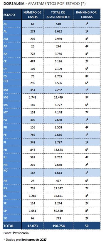 sete estados, porém, a dorsalgia é a primeira causa de afastamento, incluindo