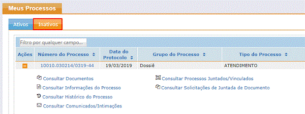 "Legislação e Processo", "Processos Digitais (e-Processo)", "Meus Processos", selecionando a aba "Inativos",