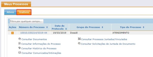 e Processo", "Processos Digitais (e-Processo)", "Meus Processos", selecionando a aba "Inativos",