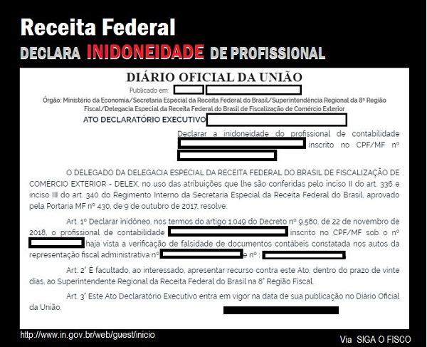 por meio de Ato Declatório declarou inidoneidade de profissional da contabilidade.