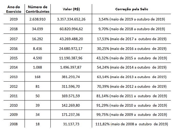 Os montantes de restituição para cada exercício, e a respectiva taxa selic