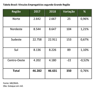 Região Nordeste (18,5% do estoque, 8,6 milhões de postos de trabalho), Região