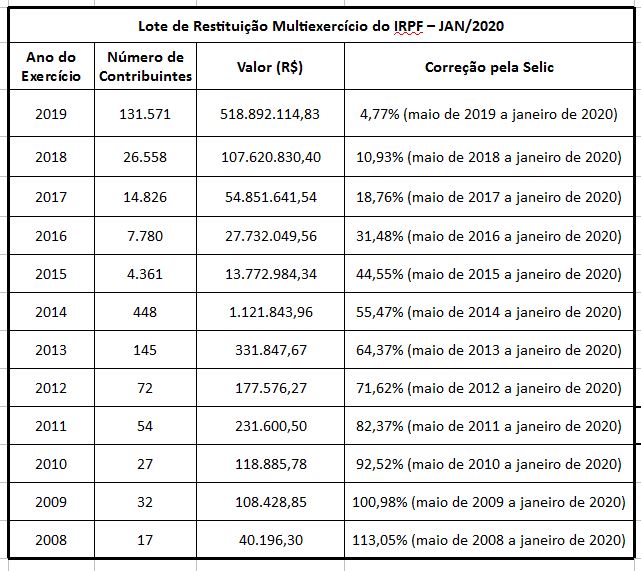 restituição para cada exercício, e a respectiva taxa Selic aplicada, podem ser