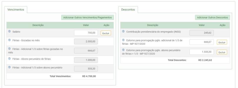 automaticamente calculados e incluídos nas folhas dos meses das férias.