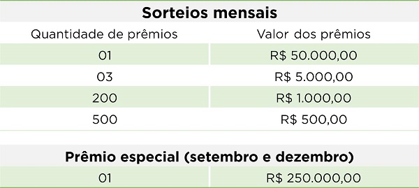 cada ano. Além disso, haverá um prêmio especial de R$ 250 mil nos meses de