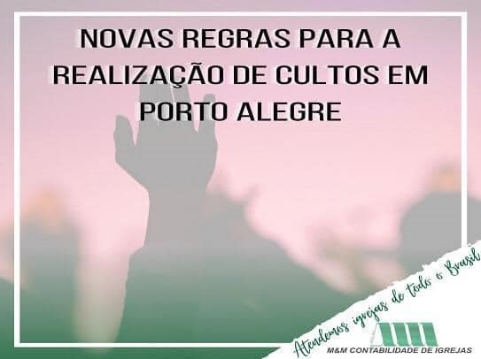 abertas, e/ou sistema de renovação de ar; - Afixação de cartazes, nas entradas e ambientes, indicando a lotação máxima e o uso obrigatório de máscara; - Vetar e coibir qualquer aglomeração. Fonte: Decreto Municipal de Porto Alegre 21.138/2021; Site do Governo do Estado do RS, com texto elaborado pela M&M Contabilidade de Igrejas.