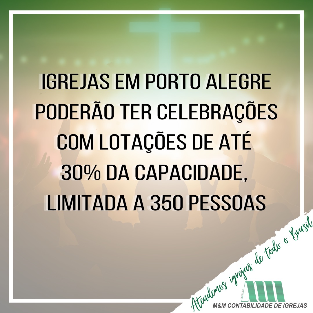 O município de Porto Alegre alterou o Decreto que previa ampliação do público nas Igrejas. Inicialmente, o decreto previa a ampliação de público somente para os dias que antecediam o natal. Porém, com o novo decreto as novas regras de ampliação de público seguem por prazo indeterminado. Assim, fica permitida a realização de cultos, missas, etc. no município de Porto Alegre, observado: a) limite de 350 (trezentas e cinquenta) pessoas simultâneas; b) lotação não excedente a 30% (trinta por cento) da capacidade máxima de ocupação prevista no alvará de proteção e prevenção contra incêndio (PPCI);