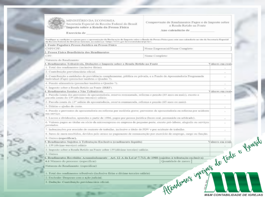 do Brasil. a) No momento da Rescisão do Contrato de Trabalho, se esta ocorrer antes de 28 de fevereiro; b) No caso de extinção (baixa) da Igreja/ONG por cisão total, encerramento da liquidação, fusão ou incorporação, o comprovante deverá ser fornecido até o último dia útil do mês subsequente ao da ocorrência do evento, se este ocorrer antes de 28 de fevereiro. No caso de rendimentos não sujeitos à retenção do imposto sobre a renda na fonte, pagos por Igrejas ou demais Pessoas Jurídicas, o comprovante deverá ser entregue, no mesmo prazo acima, desde que o beneficiário o tenha solicitado até o dia 15 de janeiro de 2023. No caso de documento físico, a entrega deverá ser feita mediante recibo (protocolo) ou envio através dos Correios. Destaca-se que o prazo final não é o relativo a postagem nos Correios, mas sim ao do recebimento. Portanto, as Igrejas e demais pessoas jurídicas que optarem por envio pelos Correios, deverão fazê-lo com a devida antecedência. É permitida a disponibilização, por meio da Internet, do comprovante para a pessoa física que possua endereço eletrônico. Também é facultada, mediante acesso restrito, a disponibilização do comprovante ao beneficiário, em endereço eletrônico da Igreja e das demais pessoas jurídicas (site, intranet, aplicativos, etc.). Nestes casos, fica dispensado o fornecimento da via impressa. Porém, a pessoa física que teve seu Comprovante disponibilizado pela internet, poderá solicitar, sem ônus, o fornecimento da via impressa do comprovante. O comprovante será fornecido com a indicação da natureza e do montante dos rendimentos, das deduções e do imposto sobre a renda retido na fonte (IRRF) no ano-calendário, pelo valor total anual, expresso em reais, bem como de informações complementares, observadas as instruções baixadas pela Receita Federal do Brasil. A Igreja ou qualquer outra fonte pagadora que deixar de fornecer aos beneficiários, dentro do prazo fixado acima, ou fornecer, com inexatidão, o Comprovante de Rendimentos Pagos e de Imposto sobre a Renda Retido na Fonte, ficará sujeita ao pagamento de multa de R$ 41,43, por documento. O Comprovante pode ser emitido automaticamente pelo programa da DIRF. A Igreja ou qualquer outra fonte pagadora que prestar informação falsa sobre rendimentos pagos, deduções ou imposto sobre a renda retido na fonte, será aplicada multa de 300% sobre o valor que for indevidamente utilizável, tais como redução do imposto a pagar ou aumento do imposto a restituir ou a compensar, independentemente de outras penalidades administrativas ou criminais. Documento é utilizado pelo beneficiário como comprovante de rendimento para elaborar a sua Declaração de Imposto de Renda Pessoa Física Nas igrejas, as situações mais comuns de obrigatoriedade da entrega do comprovante são para os ministros de confissão religiosa (pastores, evangelistas, etc.), pela remuneração (prebenda, côngrua, etc.) e para os proprietários de imóveis, pelos aluguéis pagos. Destaca-se que será aplicada a multa de 300% sobre o valor que for indevidamente utilizável, tais como rendimentos pagos, deduções ou imposto sobre a renda retido na fonte, redução do imposto a pagar ou aumento do imposto a restituir ou a compensar, independentemente de outras penalidades administrativas ou criminais, aquele que se beneficiar da informação, sabendo ou devendo saber ser falsa. Matéria atualizada em 14/02/2023, com as disposições da Instrução Normativa da Receita Federal do Brasil nº 2060/2021 e informações no site da Receita Federal do Brasil. Fonte: M&M Contabilidade de Igrejas