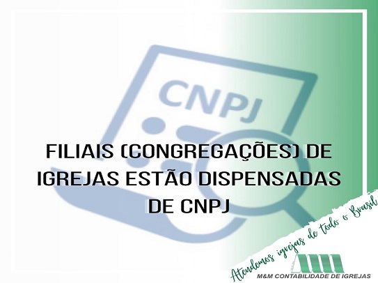 Até um tempo atrás todas as igrejas (matriz e filiais - congregações) necessitavam ter CNPJ. Assim como nas empresas que possuem filiais, utiliza-se o número básico do CNPJ da matriz (oito primeiros dígitos que ficam antes da Barra) que vai sendo complementado com o número da filial, logo após a barra. Ex. /0001, /0002, /0003, /0004 e assim sucessivamente. Com a publicação da Instrução Normativa da Receita Federal do Brasil 1897/2019, “ficam dispensados da inscrição no CNPJ os estabelecimentos de organizações religiosas que não tenham autonomia administrativa ou que não sejam gestores de orçamento."