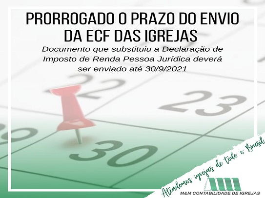 A Escrituração Contábil Fiscal (ECF) substitui a Declaração de Informações Econômico-Fiscais da Pessoa Jurídica (DIPJ), e deverá ser transmitida até 30/9/2021, com informações relativas ao ano anterior. Inicialmente, o prazo de envio era 30/7/2021 mas, em virtude da pandemia do Covid-19, foi prorrogado para 30/9/2021. Todas as igrejas deverão entregar a ECF, independente da faixa de receita bruta. A não apresentação ou entrega em atraso da ECF está sujeita a multas e poderá ficar com pendências junto a Receita Federal do Brasil. Podendo, inclusive, ficar com o CNPJ inapto, bem como impossibilitado de obter Certidão Negativa de Débitos junto a Receita Federal do Brasil, dificultando, assim, a abertura e manutenção de contas bancárias, obtenção de financiamentos, compra e venda de veículos e de bens imóveis. Saiba mais sobre a ECF - Escrituração Contábil Fiscal, acessando a matéria em nosso site, a partir do link: https://igrejas.mmcontabilidade.com.br/materias.aspx?idmat=84