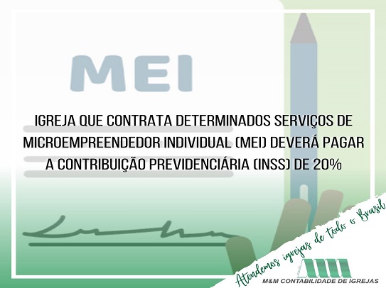 Quando uma Igreja contratar serviços de hidráulica, eletricidade, pintura, alvenaria, carpintaria e de manutenção ou reparo de veículos e o prestador de serviços for um MEI – Microempreendedor Individual haverá necessidade da Igreja efetuar o pagamento da Contribuição Previdenciária Patronal (INSS) de 20% sobre os valores dos serviços tomados.