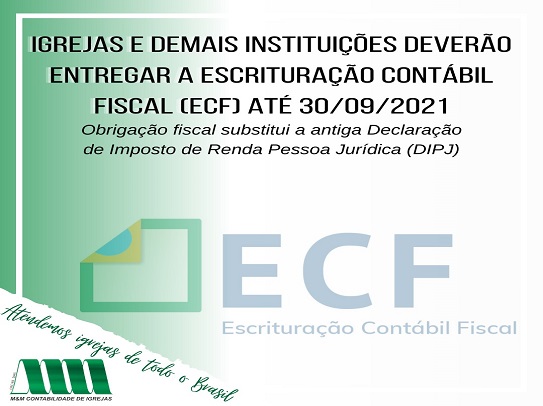 Obrigação Fiscal substitui a antiga Declaração de Imposto de Renda Pessoa Jurídica (DIPJ) A Escrituração Contábil Fiscal (ECF) substitui a Declaração de Informações Econômico-Fiscais da Pessoa Jurídica (DIPJ), e deverá ser transmitida até 30/9/2021, com informações relativas ao ano anterior. Inicialmente, o prazo de envio era 30/7/2021 mas, em virtude da pandemia do Covid-19, foi prorrogado para 30/9/2021. Todas as igrejas deverão entregar a ECF, independente da faixa de receita bruta. A ECF deverá ser assinada eletronicamente mediante certificado digital (Certificado Digital é uma assinatura eletrônica com validade jurídica que garante proteção às transações eletrônicas e outros serviços via internet, permitindo que pessoas e empresas se identifiquem e assinem digitalmente de qualquer lugar do mundo com mais segurança e agilidade); A não apresentação ou entrega em atraso da ECF as multas seguintes: - 0,5% do valor da receita bruta da pessoa jurídica no período a que se refere a escrituração aos que não enviarem a declaração; - 5% sobre o valor da operação correspondente, limitada a 1% do valor da receita bruta da pessoa jurídica no período a que se refere a escrituração, aos que omitirem ou prestarem incorretamente as informações referentes aos registros e respectivos arquivos; e - 0,02% por dia de atraso, calculada sobre a receita bruta da pessoa jurídica no período a que se refere a escrituração, limitada a 1% desta, aos que não cumprirem o prazo estabelecido para apresentação da ECF. As Igrejas que estão obrigadas a entregar a Escrituração Contábil Digital (ECD), ou seja, aquelas com Receita Bruta anual superior a R$ 4.800.000,00 (veja matéria sobre ECD a partir do link https://igrejas.mmcontabilidade.com.br/materias.aspx?idmat=51), necessariamente deverão recuperar os dados da ECD, e terão que ter a assinatura de um contador. Para as Igrejas que não estejam obrigadas a entregar a ECD, não haverá recuperação de dados, e só será exigida a assinatura do representante legal da Igreja ou Instituição. Ou seja, não será obrigatória a assinatura do contador. A Igreja ou a Instituição sem fins lucrativos que não apresentam a ECF no prazo, além das multas acima poderá ficar com pendências junto a Receita Federal do Brasil. Podendo, inclusive, ficar com o CNPJ inapto, bem como impossibilitado de obter Certidão Negativa de Débitos junto a Receita Federal do Brasil, dificultando, assim, a abertura e manutenção de contas bancárias, obtenção de financiamentos, compra e venda de veículos e de bens imóveis. As Igrejas e as demais pessoas declarantes deverão manter todos os documentos contábeis e fiscais pelo prazo de cinco anos, contados da data da apresentação da ECF à Receita Federal do Brasil.